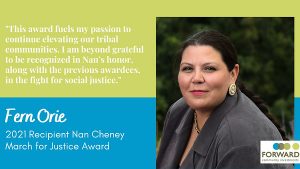 Fern Orie, a strong advocate for cultural and economic prosperity of Native Americans in Wisconsin is named the 2021 Nan Cheney March for Justice Awardee by Forward Community Investments! Fern fights tirelessly to improve the lives of Wisconsin tribal members in many ways. Knowing one way to improve these members’ lives is by infusing capital into those communities, she was the founding CEO of the Wisconsin Native Loan Fund (WINLF) a certified Native Community Development Financial Institution.